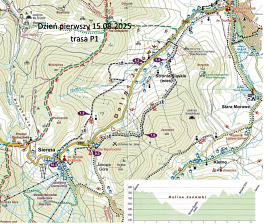 DZIEŃ 1. 15.08.2025 (piątek), Trasa P1 Dolina Janówki, Start godz. 12:00, powrót ok. 16:00 Pierwszego dnia Rajdu Strońskiego grupa piesza z Robertem Sadko odbędzie wędrówkę nad Doliną Janówki.Trasa przebiega pasem niewysokich gór zwanych Krowiarkami oraz Masywu Śnieżnika, w obrębie Sudetów Wschodnich. Szlak tworzy pętlę i łączy trzy miejscowości: Sienną, Janową Górę i Stronie Wieś. Trawersem przemkniemy bokiem szczytów: Janowa Góra (+771m n.p.m.), Janowiec (+886m n.p.m.) i Rudka (+956m n.p.m.). Poznamy historię eksploatacji marmuru w wyrobiskach „Białej Marianny i „Zielonej Marianny” w Stroniu Wieś a także historię dawnej, zanikającej i odradzającej się wsi Janowa Góra. Wędrówkę umili trasa wiodąca leśnymi ścieżkami i duktami z licznymi widokami na okoliczne wzniesienia Gór Bialskich, Złotych i Masywu Śnieżnika oraz Dolinę Janówki. Oznaczenie trasy na mapie linia przerywana kolor czarny. Trasa łatwa, w sam raz na początek Rajdu. Długość trasy ok. 10,3 km, czas przejścia 3 - 3,5 godz. najniższy punky +545 m mpm, najwyższy + 800 m, Link do pełnego opisu (kliknij) |